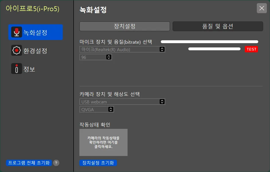 [ 메뉴 > 녹화설정 > 장치설정 > 카메라 설정 / 마이크 설정 ] 을 통해 사용할 장비를 세팅해주세요.