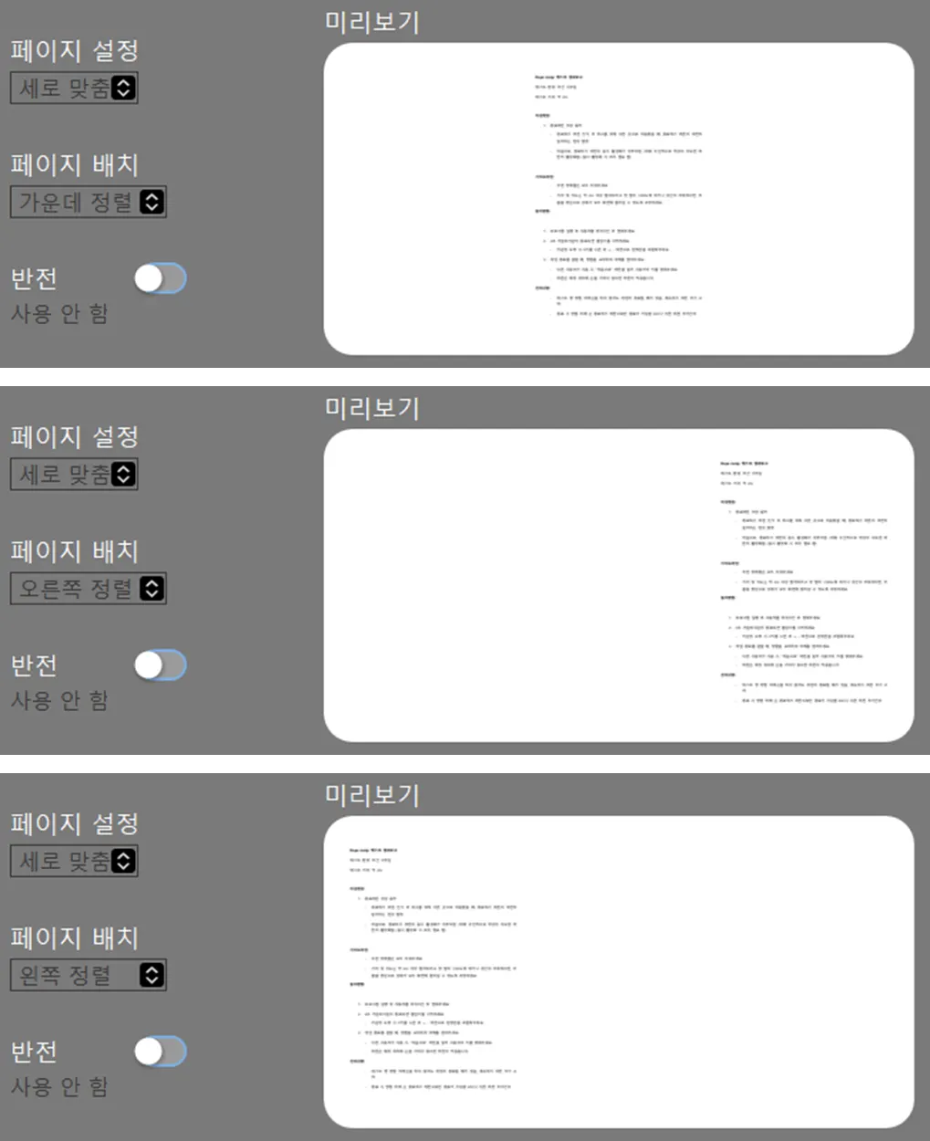 페이지 배치 (미리보기를 통해 사전 확인할 수 있습니다.)